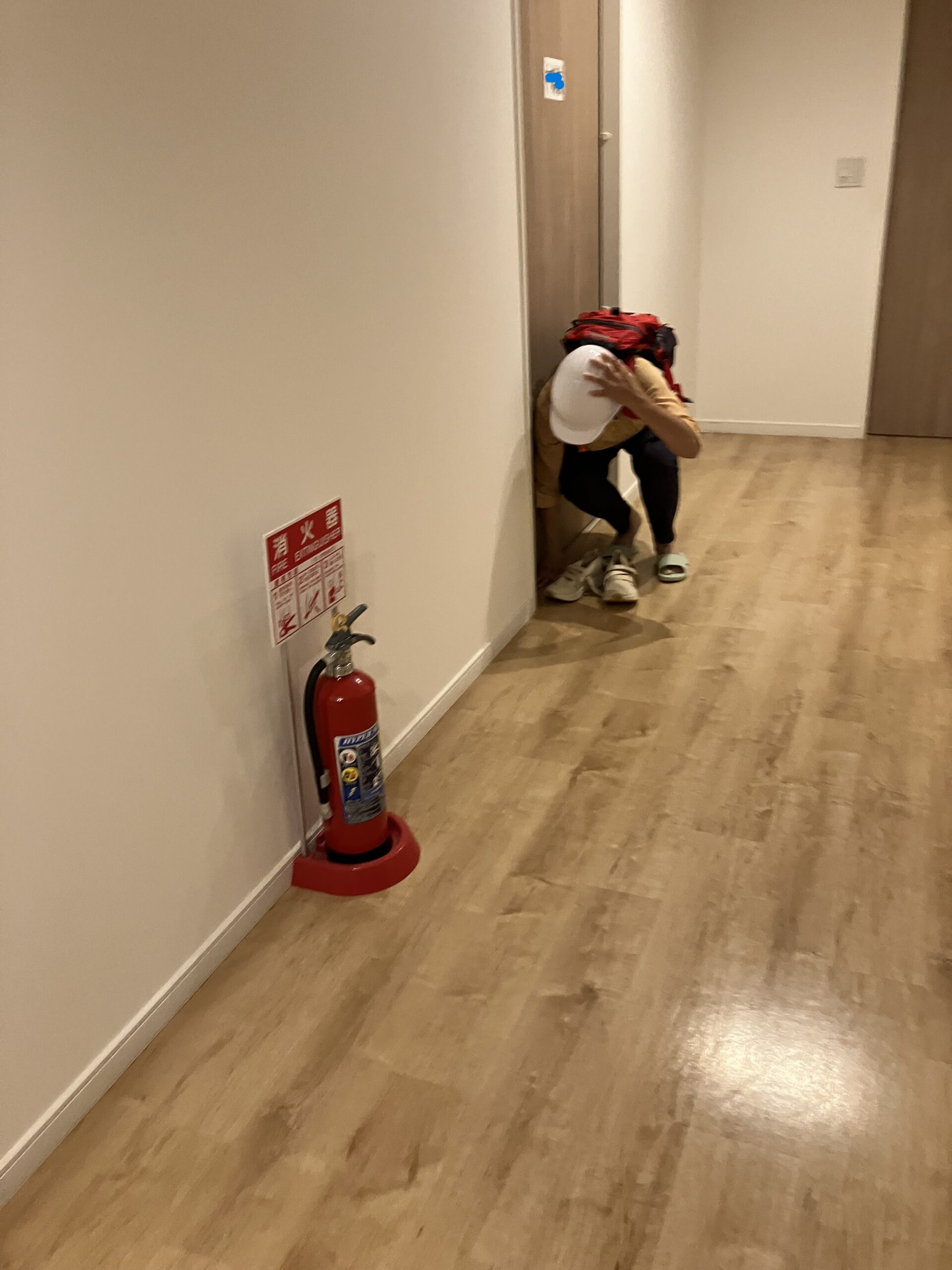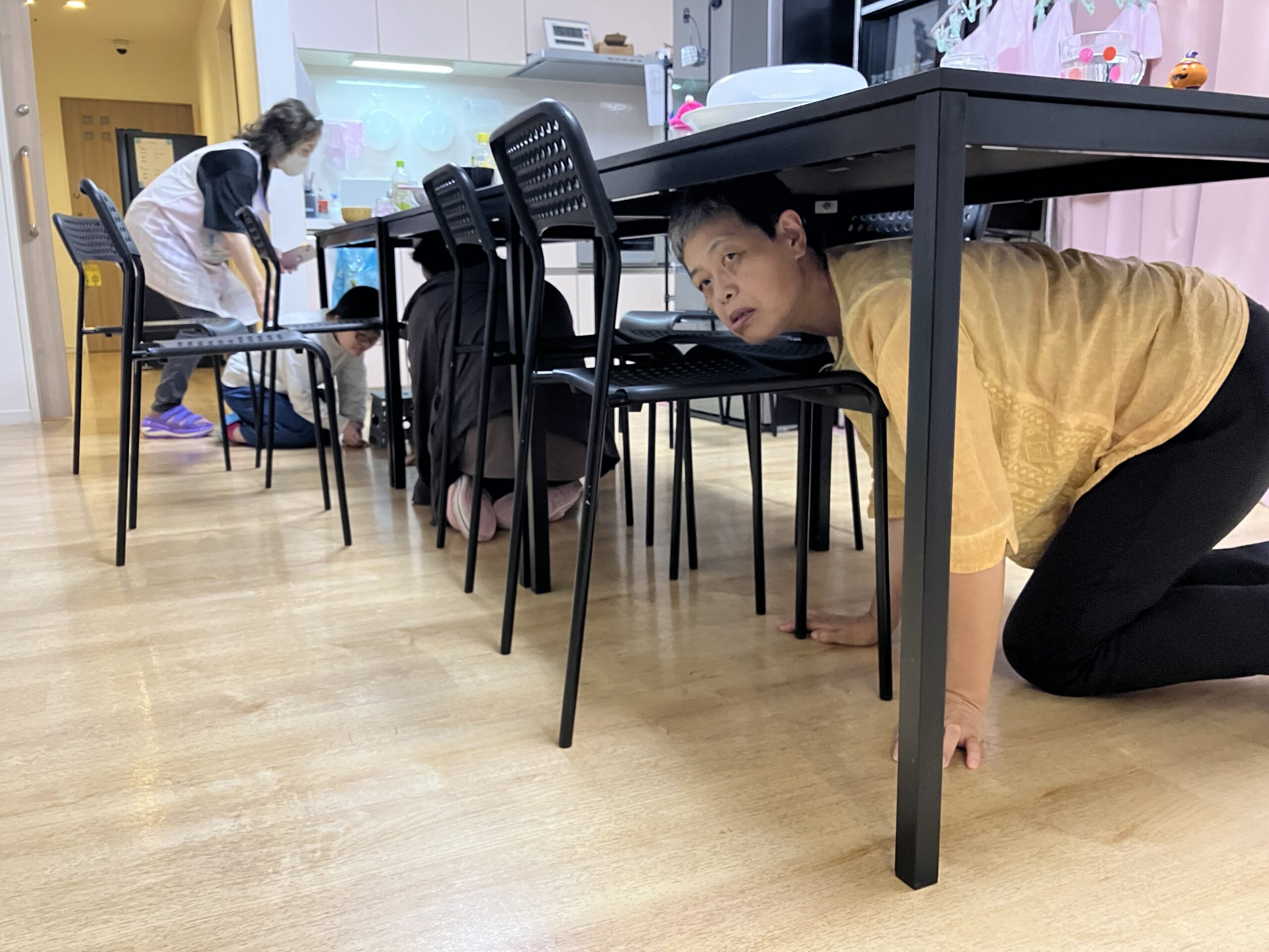 地震を想定し、自分の身を守るために段階を追って訓練しています。