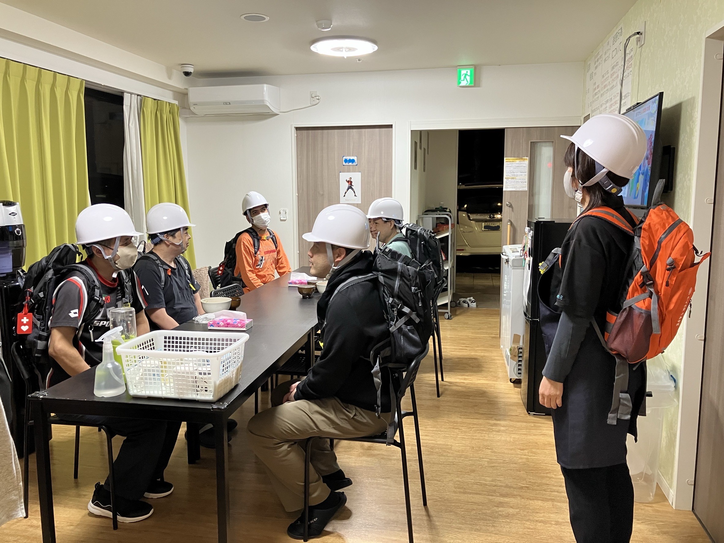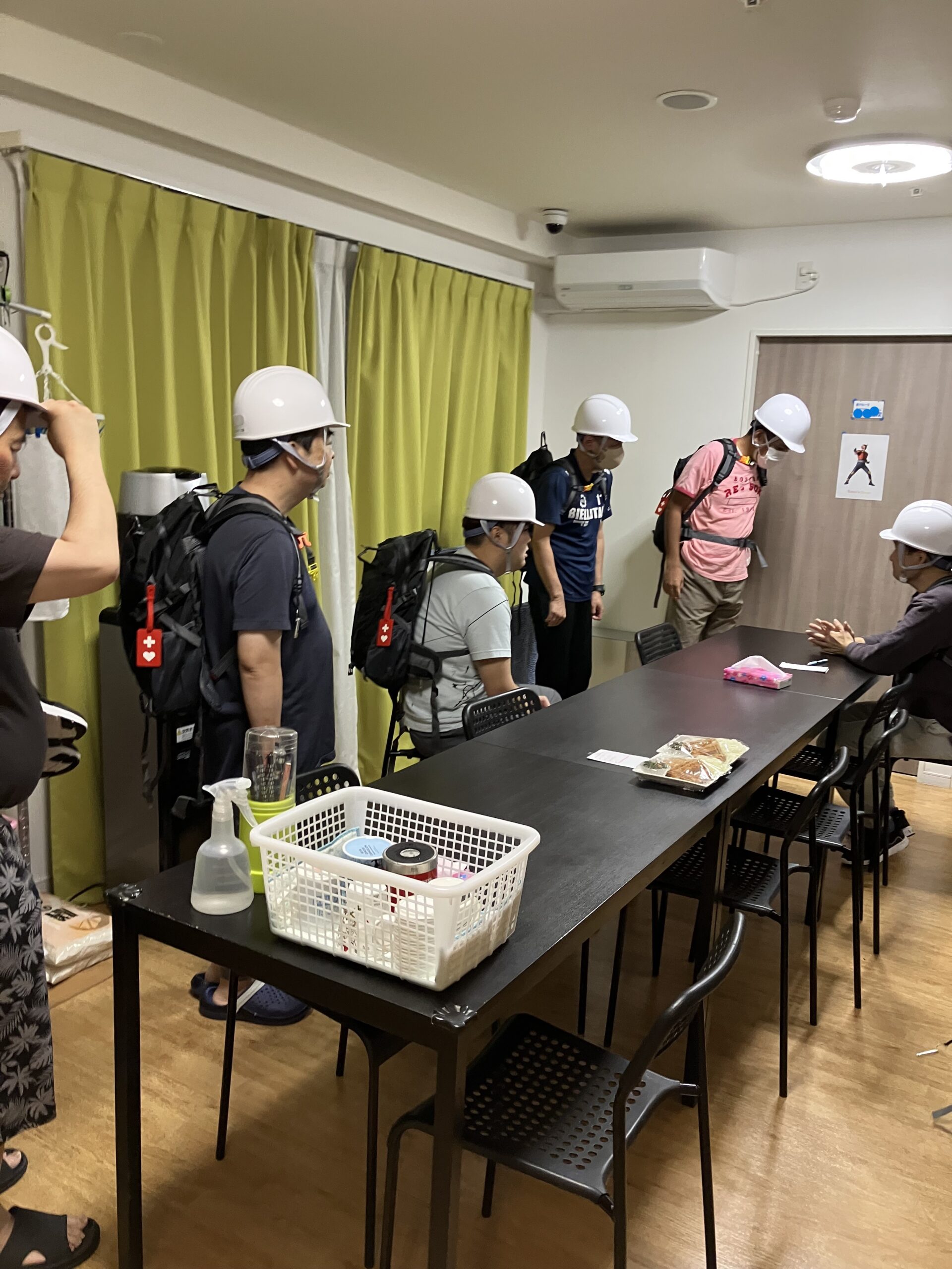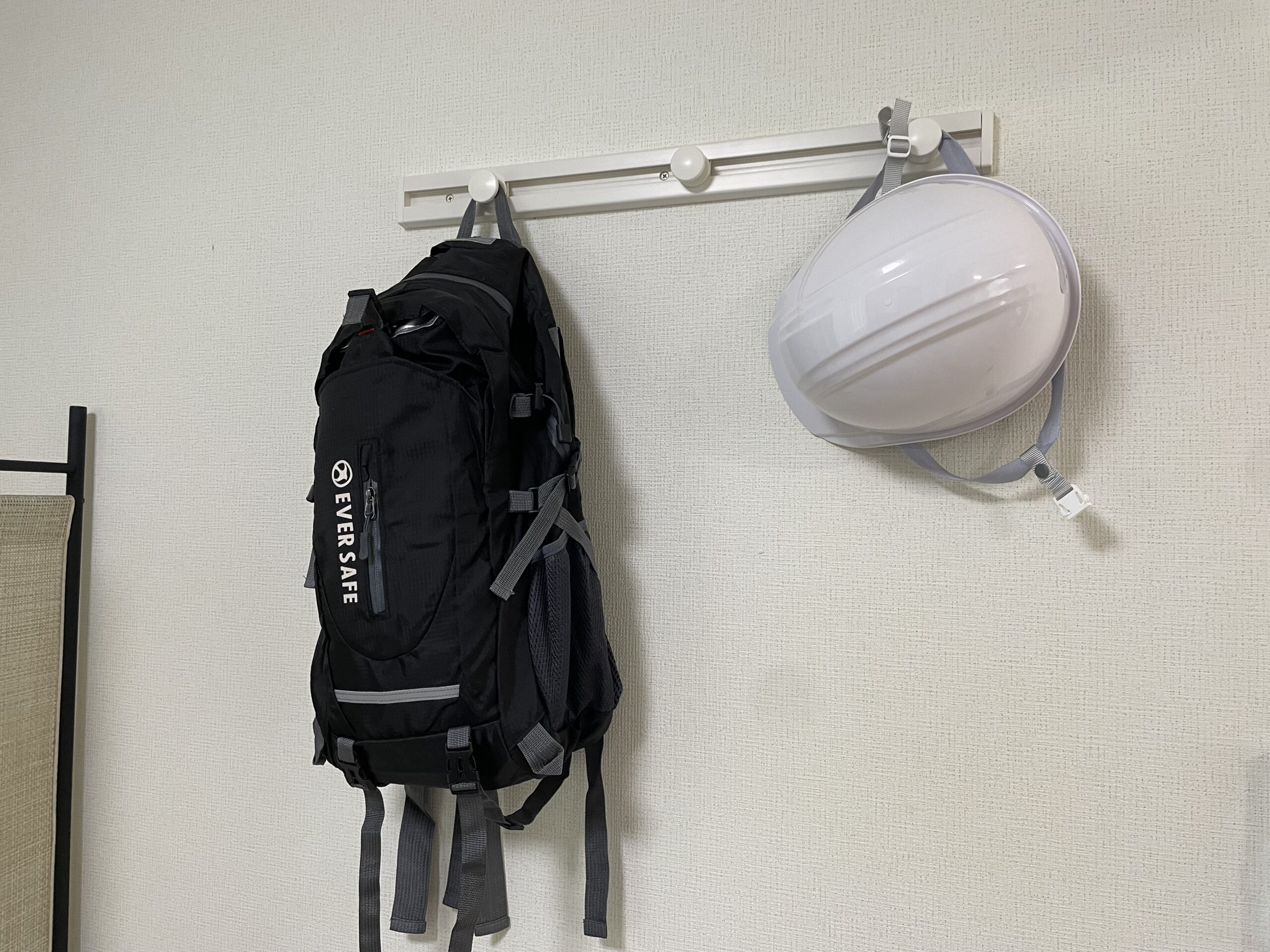 事務所にも同じように従業員用のリュック、ヘルメットを準備し避難の際は使用します。